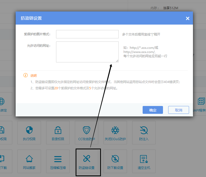 1防盗链设置即仅允许指定的网址访问受保护的文件格式,当其他网站盗用您站点文件时会显示404错误页。